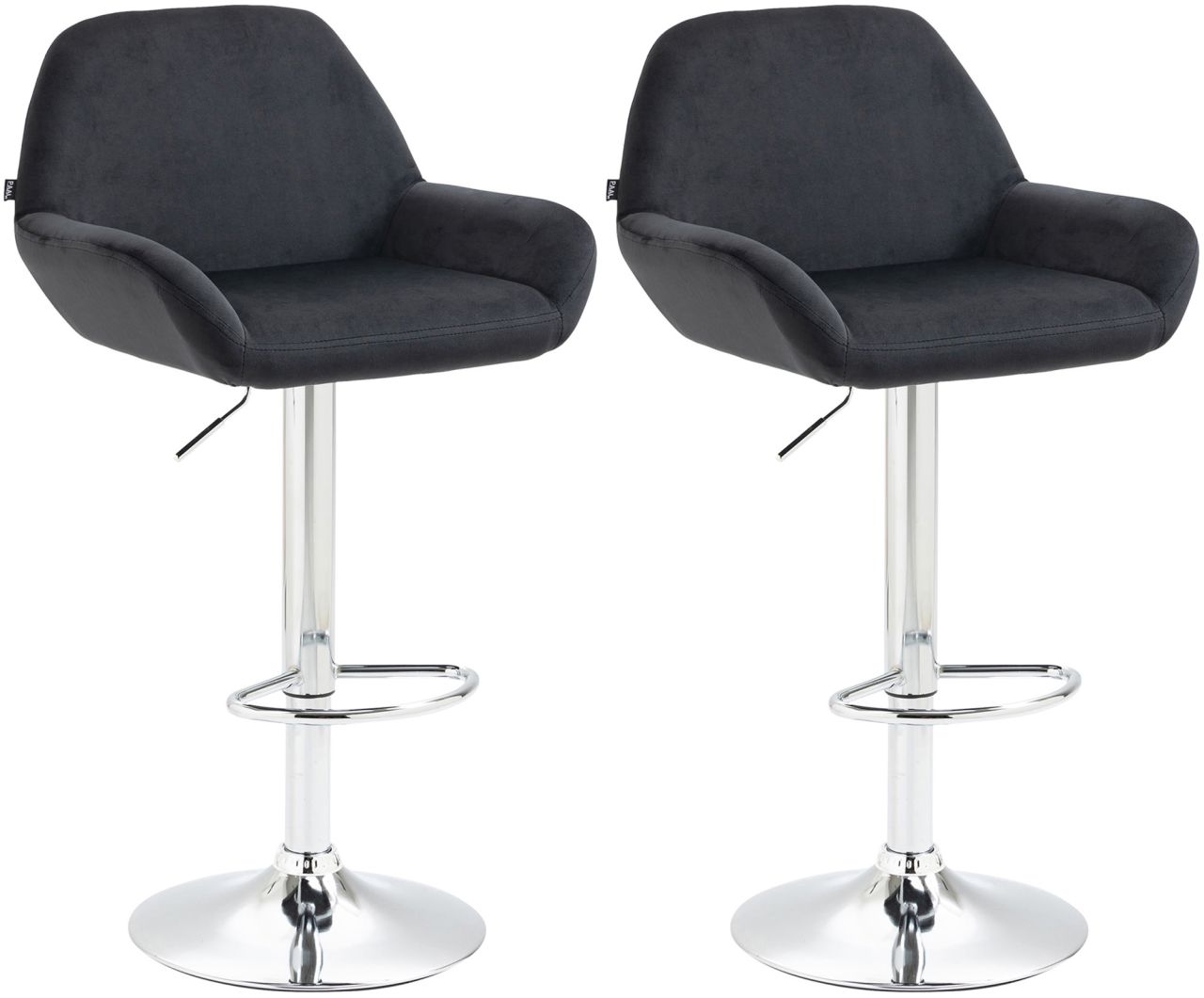 2er Set Barhocker Braga Samt Der Barhocker Braga vereint Funktionalität und Komfort in einem stilvollen Design. Der gepolsterte Sitz ist mit einem pflegeleichten Samtbezug versehen. Mithilfe des Gaslifts lässt sich dieses Modell in der Wunschhöhe stufenlos einstellen, sodass er für jede Thekenhöhe bestens geeignet ist. Die Sitzfläche ist mit der Fußablage um 360° drehbar. Die Fußstütze, die einen sehr guten Sitzkomfort gewährleistet, ist synchron mit der Höhe des Sitzes verstellbar. Das Gestell besteht aus Metall, wahlweise in Chromoptik, mattschwarz oder mattweiß. Unter dem Trompetenfuß befinden sich Bodenschoner, die ein Verkratzen des Bodens verhindern. Materialzusammensetzung: 100% Polyester Ca. Maße: Gesamthöhe: 89 – 109 cm Gesamtbreite: 51 cm Gesamttiefe: 52 cm Sitzhöhe: 63 – 83 cm Sitzfläche (BxT): 35 x 37 cm Sitzpolsterstärke: 8 cm Höhe Rückenlehne: 31 cm Höhe Armlehne (vom Bo…