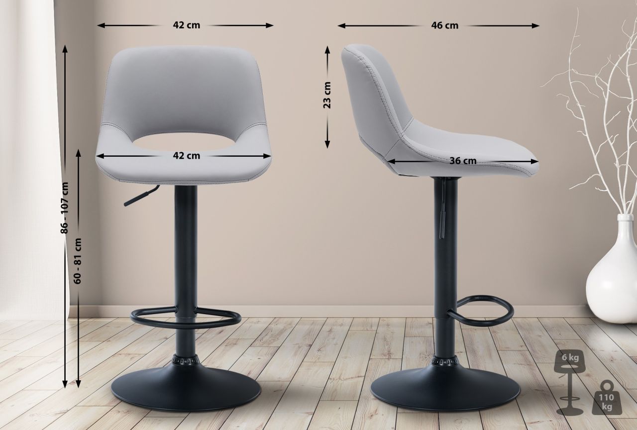 2er Set Barhocker Camden Kunstleder-Bezug Die Barhocker Camden sind eine bequeme und gleichzeitig besonders stilvolle und moderne Sitzgelegenheit für die Hausbar, die Küche und mehr. Die Barstühle verfügen über eine bequeme Polsterung über Sitzfläche und Rückenlehne, wodurch ein komfortables Sitzen auch über einen längeren Zeitraum hinaus ermöglicht wird. Die Polster sind mit pflegeleichten Kunstleder-Bezügen versehen. Die Höhenverstellbarkeit der Metallgestelle ermöglicht es Ihnen, die perfekte Sitzhöhe zu finden, und die 360-Grad-Drehfunktion sorgt für viel Bewegungsfreiheit. Die integrierten Fußstützen bieten zusätzlichen Sitzkomfort. Schließlich sind die Barstühle mit Bodenschonern ausgestattet, sodass auch empfindliche Untergründe geschont werden. Details: Gesamthöhe: 86 – 107 cm Gesamtbreite: 42 cm Gesamttiefe: 46 cm Sitzhöhe: 60 – 81 cm Sitzfläche (B x T): 42 x 36 cm Höhe der R…
