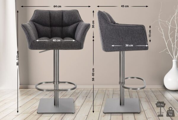 2er Set Barhocker Damaso Stoffbezug Das Set aus zwei Barhockern Damaso verbindet Eleganz mit Sitzkomfort. Mit gepolsterten Stoffbezügen eignen sich die Hocker ideal für Küche, Wohnzimmer, Esszimmer und die Hausbar. Die Rückenlehnen und Armlehnen sorgen für zusätzlichen Sitzkomfort und eine entspannte Haltung. Die Barstühle sind stufenlos höhenverstellbar, sodass die Sitzhöhe auf zwischen 58 bis 83 cm eingestellt werden kann. Die 360-Grad-Drehfunktion ermöglicht eine mühelose Bewegung. Dank der integrierten Fußablagen können die Beine entlastet werden. Die Edelstahlgestelle sind silberfarben, in matt-schwarz oder in matt-weiß erhältlich und verleihen den Hockern einen modernen Touch. Die Tresenstühle Damaso sind die perfekte Ergänzung für Bars, Küchentresen oder Lounges und bietet höchsten Sitzgenuss in stilvollem Design. Details: Gesamthöhe: 88 – 113 cm Gesamtbreite: 64 cm Gesamttiefe…