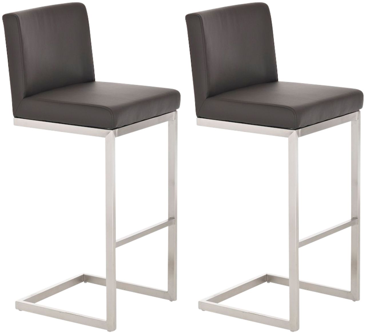 2er Set Barhocker Paros Kunstleder-Bezug Das Set aus zwei Barhockern Paros vereint modernes Design und komfortablen Sitzkomfort. Dabei sind die Barstühle perfekt geeignet für Küche, Esszimmer und Hausbar. Ihre gradlinigen Freischwinger-Gestelle aus gebürstetem Edelstahl erzeugen einen tollen Blickfang und das leichte Mitwippen der Sitze wird als sehr angenehm wahrgenommen. Integrierte Querstreben dienen als komfortable Fußablage, während die Rückenlehnen an den Sitzen den unteren Rückenbereich unterstützen. Sitzflächen und Rückenlehnen sind großzügig gepolstert und mit strapazierfähigen Kunstlederbezügen versehen. Mit Bodenschonern ausgestattet, schützen die Barhocker Paros nicht nur den Boden, sondern bieten auch einen sicheren Stand. Details: Gesamthöhe: 104 cm Gesamtbreite: 42 cm Gesamttiefe: 48 cm Sitzhöhe: 77 cm Sitzfläche (B x T): 42 x 40 cm Höhe Rückenlehne: 28 cm Max. Belastba…