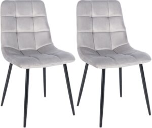 Gemütliches 2er Set Esszimmerstuhl Tilde Das 2er Stuhl Tilde schafft Raum für Gemütlichkeit. Mit hohen Rückenlehnen und einer angenehmen Polsterung lädt es zu entspannten Mahlzeiten ein. Der passende Sitzbezug aus Stoff oder Samt lässt sich aus verschiedenen, geschmackvollen Farben auswählen. Für Stabilität sorgt ein modernes 4-Fuß-Gestell aus Metall. Dank seiner pflegeleichten Oberflächen ist das Esszimmerstuhl-Set leicht zu reinigen. Darüber hinaus sind unter dem Gestell Bodenschoner angebracht, welche Kratzer und Spuren auf dem Boden verhindern. Materialzusammensetzung: 100% Polyester Ca. Maße: Gesamthöhe: 83 cm Gesamtbreite: 45 cm Gesamttiefe: 54 cm Sitzhöhe: 47 cm Sitzfläche: 45 x 38 cm Höhe Rückenlehne: 36 cm Max. Belastbarkeit: 150 kg Gewicht: 4 kg Sitz: Bezug: Samt Bezug: Stoff Angenehme Sitzposition durch Rückenlehne Gestell: Material: Metall Stabiles Vierfußgestell Sicherer …