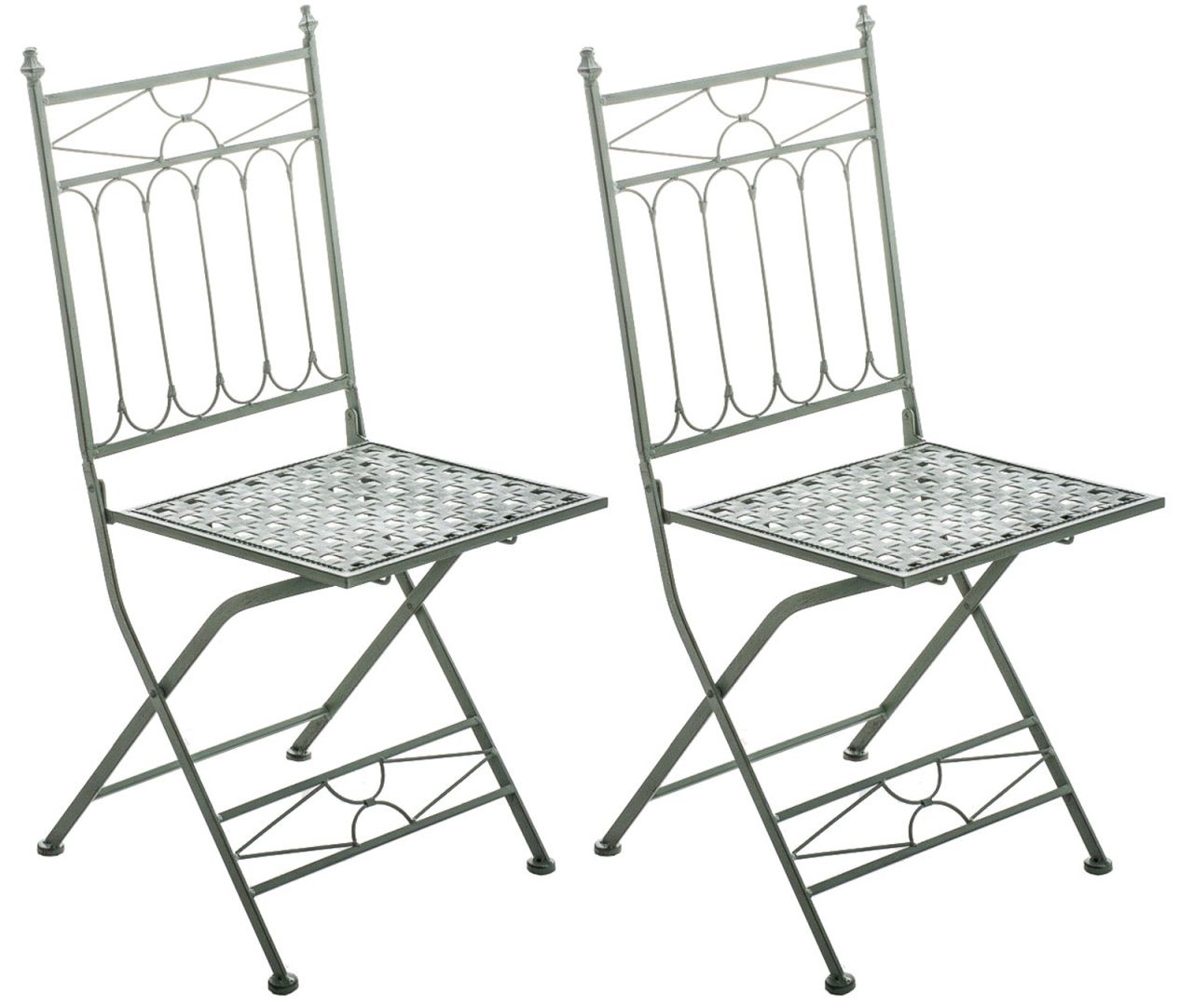 2er Set Klappstuhl Asina Diese wunderschönen Stühle im nostalgischem Design sind ein echter Hingucker auf jeder Terrasse und in jedem Garten. Das Set beeindruckt in seiner grazilen Form, wie auch in den liebevoll handgefertigten Details der Verzierungen. Dieses 2er Set eignet sich perfekt um Ihrer Gartengestaltung eine besondere Note zu geben und ist wie geschaffen Ihren lauschigen Lieblingsplatz im Garten mit seinem Charme aus längst vergangenen Zeiten zu verschönern. Die Stühle wurden aus Eisen handgefertigt und sind daher extrem stabil. Die Oberfläche ist mit in Handarbeit nachempfundener antiker Patina veredelt. Diese edlen Designstücke sind absolut neu und ergänzen sich hervorragend mit allen Metalltischen in unserem Shop. Ca. Abmessungen: Gesamthöhe: 95 cm Gesamtbreite: 40 cm Lehne: 41 x 40 cm Sitzfläche: 39 x 38 cm Sitzhöhe: 48 cm Maße zusammengeklappt: 103 x 10 cm