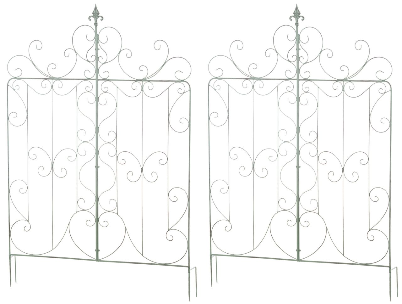 2er Set Rankgitter Mandevilla Das 2er Set Rankgitter Mandevilla ist im rustikalen Landhausstil gehalten und beeindruckt durch sein klassisches Design und die schönen Verzierungen. Es eignet sich perfekt zur Gartengestaltung und ist wie geschaffen Pflanzen dekorativ in Szene zu setzen. Das freistehende Gitterspalier ist leicht zu montieren. Die beiden Hälften müssen nur noch miteinander verschraubt und an den Erdhaken in den Boden gesteckt werden. Ca. Maße: Gesamthöhe (ohne Erdhaken): 133 cm Gesamtbreite: 99 cm Gesamttiefe: 1 cm Gewicht: 3 kg
