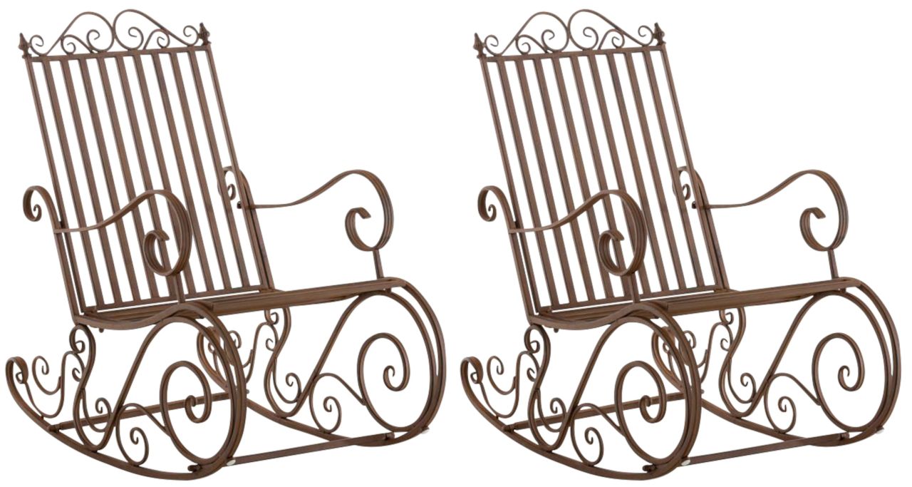 2er Set Schaukelstühle Smilla Schaukelnde Gemütlichkeit! Die Schaukelstühle Smilla im Antiklook laden nicht nur zum entspannten Sitzen und Schaukeln ein, sondern sind auch noch ein echter Hingucker! Diese exklusiven Schaukelstühle aus Eisen werden zum absoluten Highlight egal ob auf der Terrasse, dem Garten oder im Innenbereich. Die Stühle beeindrucken durch ihr nostalgisches Design und ihren liebevoll handgefertigten Details. Ob als Sitzmöglichkeit oder als zeitloser Blickfang, dekorativ sind diese Schaukelstühle allemal. Zwei wunderschönen Möbelstücke, an dem Sie lange Freude haben werden. Ca. Abmessungen: Gesamthöhe: 94 cm Gesamtbreite: 56 cm Gesamttiefe: 90 cm Sitzhöhe: 33 cm Sitzfläche: 50 x 50 cm Breite Rückenlehne: 50 cm Höhe Rückenlehne: 67 cm Armlehnenbreite: 2,5 cm Max. Belastbarkeit: 150 kg