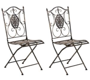 2er Set Klappbare Gartenstühle Sibell Diese Klappstühle sind ein echter Hingucker auf jeder Terrasse und in jedem Garten. Sie beeindrucken in ihrer grazilen Form, sowie liebevoll handgefertigte Details. Die wunderschönen Verzierungen machen diese Stühle zu einem besonderen Platz in Ihrem Garten und verleihen ein nostalgisches Flair. Gemütlich und praktisch zugleich: Die hohe Rückenlehne und die geschwungene Sitzfläche ermöglichen ein bequemes Sitzen. Bei Bedarf können die Eisenstühle einfach zusammengeklappt und platzsparend gelagert werden. Das Produkt wurde aus Eisen gefertigt und ist daher extrem stabil. Die Oberfläche ist mit in Handarbeit nachempfundener antiker Patina veredelt. Ca. Abmessungen: Gesamthöhe: 91,5 cm Gesamtbreite: 42 cm Gesamttiefe: 49 cm Sitzhöhe: 42 cm Sitzfläche (BxT): 39 x 36 cm Breite Rückenlehne: 39 cm
