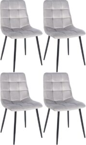 4er Set Esszimmerstuhl Tilde ist ein stilvolles Genusserlebnis Mit dem 4er Stuhl Tilde findet sich Gemütlichkeit am Esstisch ein. Jeder Stuhl trägt mit einer hohen Rückenlehne und einer angenehmen Polsterung dazu bei, dass ein komfortabler Sitzkomfort am Esstisch gewährleistet ist. Der passende Sitzbezug aus Stoff oder Samt lässt sich aus verschiedenen, geschmackvollen Farben auswählen. Für Stabilität sorgt ein modernes 4-Fuß-Gestell aus Metall. Dank seiner pflegeleichten Oberflächen ist das Esszimmerstuhl-Set leicht zu reinigen. Darüber hinaus sind unter dem Gestell Bodenschoner angebracht, welche Kratzer und Spuren auf dem Boden verhindern. Materialzusammensetzung: 100% Polyester Ca. Maße: Gesamthöhe: 83 cm Gesamtbreite: 45 cm Gesamttiefe: 54 cm Sitzhöhe: 47 cm Sitzfläche: 45 x 38 cm Höhe Rückenlehne: 36 cm Max. Belastbarkeit: 150 kg Gewicht: 4 kg Sitz: Bezug: Samt Bezug: Stoff Ange…