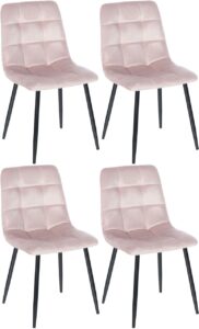 4er Set Esszimmerstuhl Tilde ist ein stilvolles Genusserlebnis Mit dem 4er Stuhl Tilde findet sich Gemütlichkeit am Esstisch ein. Jeder Stuhl trägt mit einer hohen Rückenlehne und einer angenehmen Polsterung dazu bei, dass ein komfortabler Sitzkomfort am Esstisch gewährleistet ist. Der passende Sitzbezug aus Stoff oder Samt lässt sich aus verschiedenen, geschmackvollen Farben auswählen. Für Stabilität sorgt ein modernes 4-Fuß-Gestell aus Metall. Dank seiner pflegeleichten Oberflächen ist das Esszimmerstuhl-Set leicht zu reinigen. Darüber hinaus sind unter dem Gestell Bodenschoner angebracht, welche Kratzer und Spuren auf dem Boden verhindern. Materialzusammensetzung: 100% Polyester Ca. Maße: Gesamthöhe: 83 cm Gesamtbreite: 45 cm Gesamttiefe: 54 cm Sitzhöhe: 47 cm Sitzfläche: 45 x 38 cm Höhe Rückenlehne: 36 cm Max. Belastbarkeit: 150 kg Gewicht: 4 kg Sitz: Bezug: Samt Bezug: Stoff Ange…