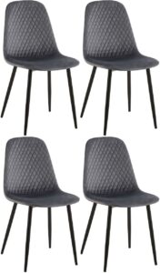 4er Set Stühle Giverny Die Stühle Giverny sind bequemen und zugleich stilvollen Sitzgelegenheiten für den täglichen Gebrauch. Der Sitz ist mit einem pflegeleichten Stoff bezogen und überzeugt mit ansprechender Optik. Zudem sind die Sitzflächen mit Ziernähten versehen. Auf dem modernen 4-Fuß Gestell aus Metall stehen diese Stühle bei jedem Anlass gut da, zudem befinden sich Bodenschoner unter den Füßen, die ein Verkratzen des Bodens verhindern. Diese Polsterstühle verleihen ein modernes Flair und ergänzen wunderbar jedes Wohnambiente. Details: Gesamthöhe: 88 cm Gesamtbreite: 44 cm Gesamttiefe: 54 cm Sitzhöhe: 47 cm Sitzfläche (B x T): 44 x 40 cm Höhe Rückenlehne: 41 cm Max. Belastbarkeit: 150 kg Gewicht: 4 kg Materialzusammensetzung: 100% Polyester Sitz: Bezug: Samt Bezug: Stoff Angenehme Sitzposition durch Rückenlehne Gestell: Material: Metall Stabiles Vierfußgestell Sicherer Stand Be…