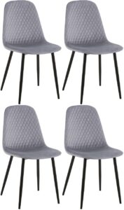 4er Set Stühle Giverny Die Stühle Giverny sind bequemen und zugleich stilvollen Sitzgelegenheiten für den täglichen Gebrauch. Der Sitz ist mit einem pflegeleichten Stoff bezogen und überzeugt mit ansprechender Optik. Zudem sind die Sitzflächen mit Ziernähten versehen. Auf dem modernen 4-Fuß Gestell aus Metall stehen diese Stühle bei jedem Anlass gut da, zudem befinden sich Bodenschoner unter den Füßen, die ein Verkratzen des Bodens verhindern. Diese Polsterstühle verleihen ein modernes Flair und ergänzen wunderbar jedes Wohnambiente. Details: Gesamthöhe: 88 cm Gesamtbreite: 44 cm Gesamttiefe: 54 cm Sitzhöhe: 47 cm Sitzfläche (B x T): 44 x 40 cm Höhe Rückenlehne: 41 cm Max. Belastbarkeit: 150 kg Gewicht: 4 kg Materialzusammensetzung: 100% Polyester Sitz: Bezug: Samt Bezug: Stoff Angenehme Sitzposition durch Rückenlehne Gestell: Material: Metall Stabiles Vierfußgestell Sicherer Stand Be…