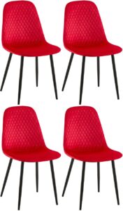 4er Set Stühle Giverny Die Stühle Giverny sind bequemen und zugleich stilvollen Sitzgelegenheiten für den täglichen Gebrauch. Der Sitz ist mit einem pflegeleichten Stoff bezogen und überzeugt mit ansprechender Optik. Zudem sind die Sitzflächen mit Ziernähten versehen. Auf dem modernen 4-Fuß Gestell aus Metall stehen diese Stühle bei jedem Anlass gut da, zudem befinden sich Bodenschoner unter den Füßen, die ein Verkratzen des Bodens verhindern. Diese Polsterstühle verleihen ein modernes Flair und ergänzen wunderbar jedes Wohnambiente. Details: Gesamthöhe: 88 cm Gesamtbreite: 44 cm Gesamttiefe: 54 cm Sitzhöhe: 47 cm Sitzfläche (B x T): 44 x 40 cm Höhe Rückenlehne: 41 cm Max. Belastbarkeit: 150 kg Gewicht: 4 kg Materialzusammensetzung: 100% Polyester Sitz: Bezug: Samt Bezug: Stoff Angenehme Sitzposition durch Rückenlehne Gestell: Material: Metall Stabiles Vierfußgestell Sicherer Stand Be…