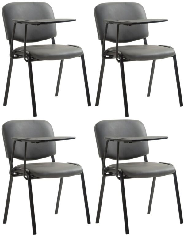 4er Set Stühle Ken mit Klapptisch Das Set für vier Personen schafft eine komfortable Umgebung für Meetings, Vorlesungen und Konferenzen. Jeder Stuhl ist bequem gepolstert und zusätzlich auf der rechten Seite mit einer klappbaren Ablagefläche ausgestattet. Diese eignet sich bestens als Arbeitsfläche. Durch den Tisch sind die Stühle nicht stapelbar. Ein modernes 4-Fuß Gestell aus Metall sorgt für Stabilität. Mit dem Set aus vier Konferenzstühlen lassen sich schöne Sitzkompositionen erstellen. Materialzusammensetzung: 100% Polyurethan Ca. Maße: Gesamthöhe: 81 cm Gesamtbreite: 53 cm Gesamttiefe: 71 cm Sitzhöhe: 46 cm Sitzfläche (BxT): 48 x 40 cm Tischhöhe: 69 cm Höhe der Rückenlehne: 38 cm Gewicht: 6 kg Sitz: Material: Kunstleder Sitz und Rückenlehne bequem gepolstert Gestell: Material: Metall 4-Fuß Gestell Farbe: Schwarz Besonderheiten: Mit Klapptisch Stabile Konstruktion und strapazierf…