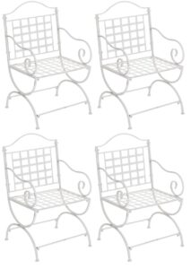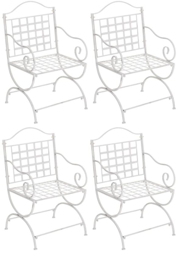 4er Set Gartenstühle Lotta Diese wunderschönen Stühle in nostalgischem Design sind ein echter Hingucker auf jeder Terrasse und in jedem Garten. Sie beeindrucken mit ihrer grazilen Form, wie auch mit den liebevoll handgefertigten Details der Verzierungen. Sie eignen sich perfekt, um Ihrer Gartengestaltung eine besondere Note zu verleihen. Diese Gartenstühle verschönern Ihren Lieblingsplatz im Garten mit Charme längst vergangener Zeiten. Das Produkt wurde aus Eisen handgefertigt und ist daher extrem stabil. Die Oberfläche ist mit in Handarbeit nachempfundener antiker Patina veredelt. Ca. Abmessungen: Gesamthöhe: 92 cm Gesamtbreite: 56 cm Gesamttiefe: 53 cm Sitzhöhe: 43 cm Sitztiefe: 43 cm Höhe Rückenlehne: 51 cm Höhe Armlehne (hinten): 65,5 cm Höhe Armlehne (vorn): 62 cm Rohrdurchmesser: 2 cm