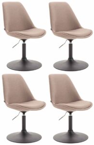 4er Set Esszimmerstühle Maverick Stoff – Modernes Design kombiniert mit Komfort! Die Lehnstühle Maverick sind bequeme und zugleich stilvolle Sitzgelegenheiten für den täglichen Gebrauch. Die mit Stoff überzogenen Sitzschalen sind im Sitz- und Rückenbereich gepolstert, sodass ein bequemes Sitzen auch über einen längeren Zeitraum kein Problem ist. Das Modell ist sowohl höhenverstellbar als auch um 360° drehbar und verspricht somit mehr Flexibilität. Der Trompetenfuß aus Metall in Chromoptik oder in matt- schwarzem/weißem Metall steht für hohe Stabilität und Langlebigkeit. Diese Polsterstühle verleihen ein modernes Flair und ergänzen wunderbar jedes Wohnambiente. Materialzusammensetzung: 100% Polyester Ca. Maße: Gesamthöhe: 76 – 81 cm Gesamtbreite: 48 cm Gesamttiefe: 57 cm Sitzhöhe: 43 – 48 cm Sitzfläche (BxT): 48 x 52 cm Höhe der Rückenlehne: 32 cm Gewicht: 6 kg Sitz: Bezug: Stoff Höhen…