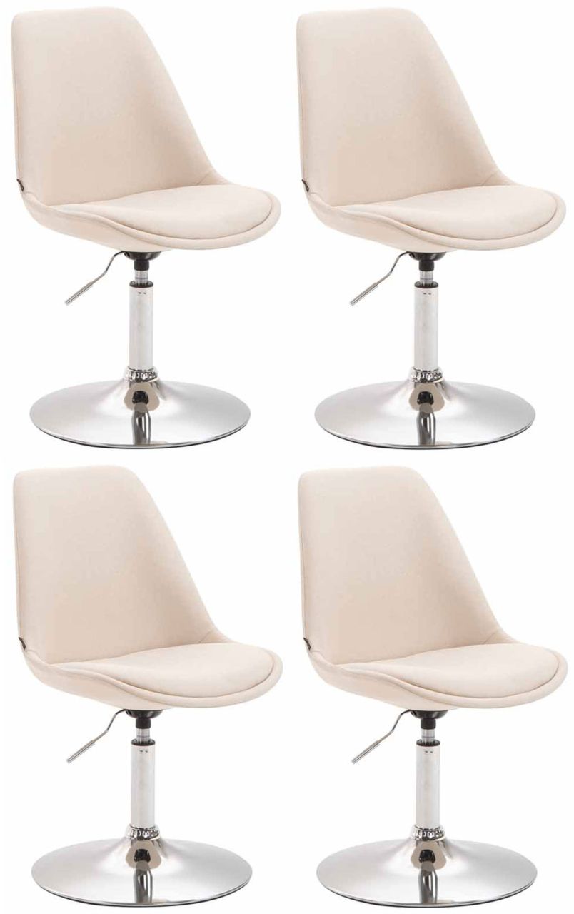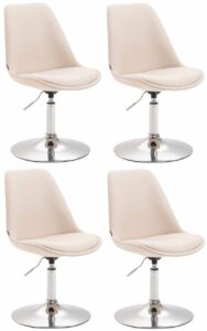 4er Set Esszimmerstühle Maverick Stoff – Modernes Design kombiniert mit Komfort! Die Lehnstühle Maverick sind bequeme und zugleich stilvolle Sitzgelegenheiten für den täglichen Gebrauch. Die mit Stoff überzogenen Sitzschalen sind im Sitz- und Rückenbereich gepolstert, sodass ein bequemes Sitzen auch über einen längeren Zeitraum kein Problem ist. Das Modell ist sowohl höhenverstellbar als auch um 360° drehbar und verspricht somit mehr Flexibilität. Der Trompetenfuß aus Metall in Chromoptik oder in matt- schwarzem/weißem Metall steht für hohe Stabilität und Langlebigkeit. Diese Polsterstühle verleihen ein modernes Flair und ergänzen wunderbar jedes Wohnambiente. Materialzusammensetzung: 100% Polyester Ca. Maße: Gesamthöhe: 76 – 81 cm Gesamtbreite: 48 cm Gesamttiefe: 57 cm Sitzhöhe: 43 – 48 cm Sitzfläche (BxT): 48 x 52 cm Höhe der Rückenlehne: 32 cm Gewicht: 6 kg Sitz: Bezug: Stoff Höhen…
