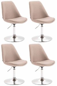 4er Set Esszimmerstühle Maverick Stoff – Modernes Design kombiniert mit Komfort! Die Lehnstühle Maverick sind bequeme und zugleich stilvolle Sitzgelegenheiten für den täglichen Gebrauch. Die mit Stoff überzogenen Sitzschalen sind im Sitz- und Rückenbereich gepolstert, sodass ein bequemes Sitzen auch über einen längeren Zeitraum kein Problem ist. Das Modell ist sowohl höhenverstellbar als auch um 360° drehbar und verspricht somit mehr Flexibilität. Der Trompetenfuß aus Metall in Chromoptik oder in matt- schwarzem/weißem Metall steht für hohe Stabilität und Langlebigkeit. Diese Polsterstühle verleihen ein modernes Flair und ergänzen wunderbar jedes Wohnambiente. Materialzusammensetzung: 100% Polyester Ca. Maße: Gesamthöhe: 76 – 81 cm Gesamtbreite: 48 cm Gesamttiefe: 57 cm Sitzhöhe: 43 – 48 cm Sitzfläche (BxT): 48 x 52 cm Höhe der Rückenlehne: 32 cm Gewicht: 6 kg Sitz: Bezug: Stoff Höhen…