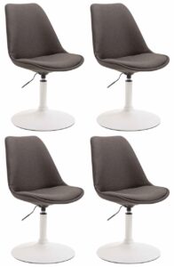 4er Set Esszimmerstühle Maverick Stoff – Modernes Design kombiniert mit Komfort! Die Lehnstühle Maverick sind bequeme und zugleich stilvolle Sitzgelegenheiten für den täglichen Gebrauch. Die mit Stoff überzogenen Sitzschalen sind im Sitz- und Rückenbereich gepolstert, sodass ein bequemes Sitzen auch über einen längeren Zeitraum kein Problem ist. Das Modell ist sowohl höhenverstellbar als auch um 360° drehbar und verspricht somit mehr Flexibilität. Der Trompetenfuß aus Metall in Chromoptik oder in matt- schwarzem/weißem Metall steht für hohe Stabilität und Langlebigkeit. Diese Polsterstühle verleihen ein modernes Flair und ergänzen wunderbar jedes Wohnambiente. Materialzusammensetzung: 100% Polyester Ca. Maße: Gesamthöhe: 76 – 81 cm Gesamtbreite: 48 cm Gesamttiefe: 57 cm Sitzhöhe: 43 – 48 cm Sitzfläche (BxT): 48 x 52 cm Höhe der Rückenlehne: 32 cm Gewicht: 6 kg Sitz: Bezug: Stoff Höhen…