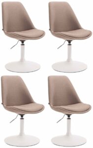 4er Set Esszimmerstühle Maverick Stoff – Modernes Design kombiniert mit Komfort! Die Lehnstühle Maverick sind bequeme und zugleich stilvolle Sitzgelegenheiten für den täglichen Gebrauch. Die mit Stoff überzogenen Sitzschalen sind im Sitz- und Rückenbereich gepolstert, sodass ein bequemes Sitzen auch über einen längeren Zeitraum kein Problem ist. Das Modell ist sowohl höhenverstellbar als auch um 360° drehbar und verspricht somit mehr Flexibilität. Der Trompetenfuß aus Metall in Chromoptik oder in matt- schwarzem/weißem Metall steht für hohe Stabilität und Langlebigkeit. Diese Polsterstühle verleihen ein modernes Flair und ergänzen wunderbar jedes Wohnambiente. Materialzusammensetzung: 100% Polyester Ca. Maße: Gesamthöhe: 76 – 81 cm Gesamtbreite: 48 cm Gesamttiefe: 57 cm Sitzhöhe: 43 – 48 cm Sitzfläche (BxT): 48 x 52 cm Höhe der Rückenlehne: 32 cm Gewicht: 6 kg Sitz: Bezug: Stoff Höhen…