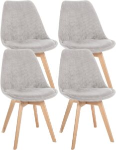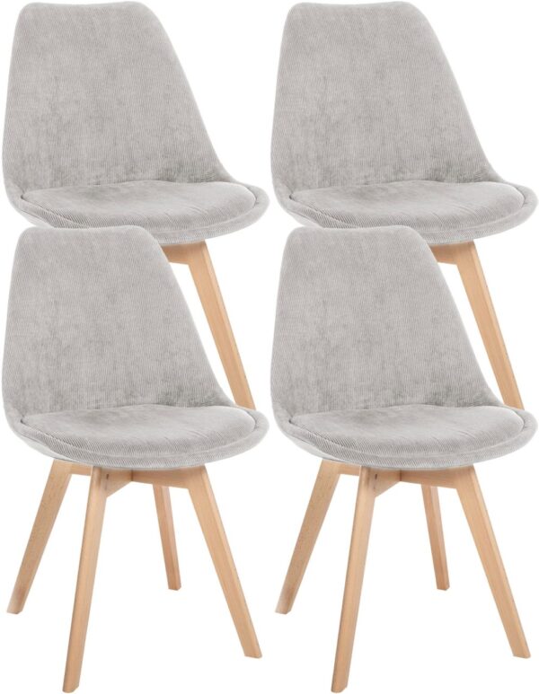 4er Set Esszimmerstuhl Linares Dieser komfortable Stuhl besticht nicht nur durch hervorragende Sitzeigenschaften, sondern auch durch den spannenden Materialmix. Die Sitzschale ist aus stabilem Kunststoff gefertigt und mit einem Sitzpolster ausgestattet. Dabei stehen verschiedenste Materialien zur Auswahl, wie Stoff, Samt, Cord, Kunstleder oder ein Bezug in Lederoptik. Die Verwendung pflegeleichter Materialien gewährleistet eine mühelose Reinigung des Esszimmerstuhls zu jeder Zeit. Getragen von einem zeitgemäßen 4-Fuß Holzgestell, aus Buchenholz, präsentiert sich der Stuhl bei jeder Gelegenheit vorteilhaft. Zudem sind Bodenschoner an den Füßen angebracht, um den Boden vor Kratzern zu schützen. Materialzusammensetzung: 100% Polyurethan (Kunststoff) / 100% Polyester (Stoff, Samt) / 75% Baumwolle + 25% Polyester (Cord) / 80% Polyester + 20% Baumwolle (Lederoptik) Ca. Maße: Gesamthöhe: 83 …