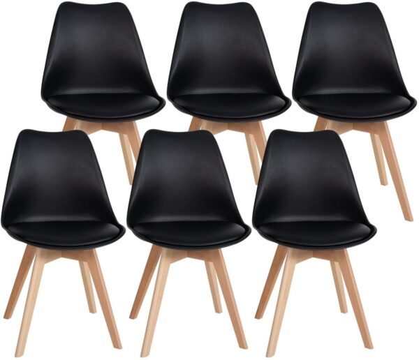 6er Set Esszimmerstuhl Ramsey Dieser Stuhl ist ein Leichtgewicht von lediglich 4 kg und dennoch außerordentlich stabil. Die Sitzhöhe von 46 cm gewährleistet eine komfortable und ergonomische Sitzposition, während die großzügige Sitzfläche bequemes Sitzen ermöglicht. Die integrierten Bodenschoner schützen Ihre Böden vor unerwünschten Spuren. Die Rückenlehne stützt Ihre Wirbelsäule optimal. Das Gestell des Stuhls ist aus hochwertigem Holz gefertigt und verleiht ihm Stabilität und natürlichen Charme. Die Sitzfläche besteht aus Kunstleder, das nicht nur visuell ansprechend ist, sondern auch leicht zu pflegen und äußerst strapazierfähig. Materialzusammensetzung: 100% Polyurethan / 100% Polypropylen Ca. Maße: Gesamthöhe: 83 cm Gesamtbreite: 49 cm Gesamttiefe: 50 cm Höhe Rückenlehne: 40 cm Sitzfläche (BxT): 39 x 44 cm Sitzhöhe: 46 cm Gewicht: 4 kg Sitz: Material: Kunststoff mit Kunstleder Si…