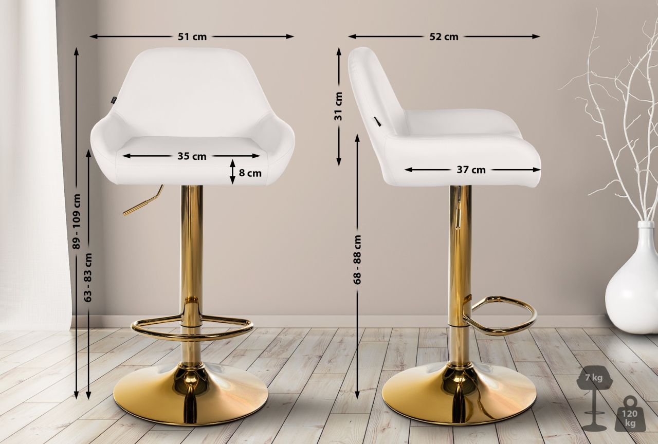 Barhocker Braga Kunstleder-Bezug mit Goldgestell Der Barhocker Braga ist ein moderner Sitzhocker mit einem Metallgestell in Gold-Optik. Mit seiner schicken Optik ist dieser Barstuhl eine ideal Sitzmöglichkeit für Küche, Esszimmer, Wohnzimmer oder die Hausbar. Der Sitz und die Rückenlehne sind mit einem hochwertigen Kunstleder-Bezug bezogen und bieten durch ihre Polsterung einen hohen Sitzkomfort. Eine integrierte Fußstütze fördert das Sitzen in aufrechter Haltung. Die Sitzhöhe kann mittels eines Gaslifts stufenlos angepasst werden. Die Sitzfläche ist um 360° drehbar, was zusätzliche Flexibilität ermöglicht. Das Gestell besteht aus stabilem Metall und sorgt für einen sicheren Stand. Bodenschoner unter dem Metallgestell beugen Beschädigungen empfindlicher Böden vor. Details: Gesamthöhe: 89 – 109 cm Gesamtbreite: 51 cm Gesamttiefe: 52 cm Sitzhöhe: 63 – 83 cm Sitzfläche (B x T): 35 x 37 c…
