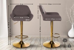 Barhocker Braga Stoffbezug mit Goldgestell Der Barhocker Braga ist ein moderner Sitzhocker mit einem Metallgestell in Gold-Optik. Mit seiner schicken Optik ist dieser Barstuhl eine ideale Sitzmöglichkeit für Küche, Esszimmer, Wohnzimmer oder die Hausbar. Der Sitz und die Rückenlehne sind mit einem pflegeleichten Stoffbezug bezogen und bieten durch ihre Polsterung einen hohen Sitzkomfort. Eine integrierte Fußstütze fördert das Sitzen in aufrechter Haltung. Die Sitzhöhe kann mittels eines Gaslifts stufenlos angepasst werden. Die Sitzfläche ist um 360° drehbar, was zusätzliche Flexibilität ermöglicht. Das Gestell besteht aus stabilem Metall und sorgt für einen sicheren Stand. Bodenschoner unter dem Metallgestell beugen Beschädigungen empfindlicher Böden vor. Details: Gesamthöhe: 89 – 109 cm Gesamtbreite: 51 cm Gesamttiefe: 52 cm Sitzhöhe: 63 – 83 cm Sitzfläche (B x T): 35 x 37 cm Sitzpol…