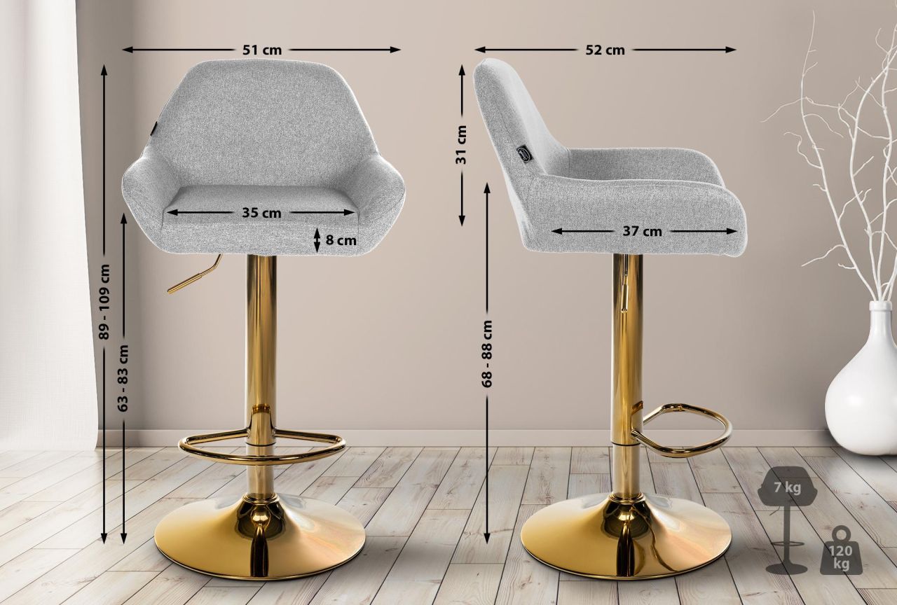 Barhocker Braga Stoffbezug mit Goldgestell Der Barhocker Braga ist ein moderner Sitzhocker mit einem Metallgestell in Gold-Optik. Mit seiner schicken Optik ist dieser Barstuhl eine ideale Sitzmöglichkeit für Küche, Esszimmer, Wohnzimmer oder die Hausbar. Der Sitz und die Rückenlehne sind mit einem pflegeleichten Stoffbezug bezogen und bieten durch ihre Polsterung einen hohen Sitzkomfort. Eine integrierte Fußstütze fördert das Sitzen in aufrechter Haltung. Die Sitzhöhe kann mittels eines Gaslifts stufenlos angepasst werden. Die Sitzfläche ist um 360° drehbar, was zusätzliche Flexibilität ermöglicht. Das Gestell besteht aus stabilem Metall und sorgt für einen sicheren Stand. Bodenschoner unter dem Metallgestell beugen Beschädigungen empfindlicher Böden vor. Details: Gesamthöhe: 89 – 109 cm Gesamtbreite: 51 cm Gesamttiefe: 52 cm Sitzhöhe: 63 – 83 cm Sitzfläche (B x T): 35 x 37 cm Sitzpol…