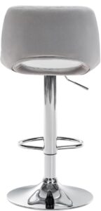 Barhocker Camden Samt-Bezug Der Barhocker Camden ist eine bequeme und gleichzeitig besonders stilvolle und moderne Sitzgelegenheit für die Hausbar, die Küche und mehr. Der Barstuhl verfügt über eine bequeme Polsterung über Sitzfläche und Rückenlehne, wodurch ein komfortables Sitzen auch über einen längeren Zeitraum hinaus ermöglicht wird. Das Polster ist mit einem hochwertigen Samt-Bezug versehen. Die Höhenverstellbarkeit des Metallgestells ermöglicht es Ihnen, die perfekte Sitzhöhe zu finden, und die 360-Grad-Drehfunktion sorgt für viel Bewegungsfreiheit. Die integrierte Fußstütze bietet zusätzlichen Sitzkomfort. Schließlich ist der Barstuhl mit Bodenschonern ausgestattet, sodass auch empfindliche Untergründe geschont werden. Details: Gesamthöhe: 86 – 107 cm Gesamtbreite: 42 cm Gesamttiefe: 46 cm Sitzhöhe: 60 – 81 cm Sitzfläche (B x T): 42 x 36 cm Höhe der Rückenlehne: 23 cm Max. Bel…