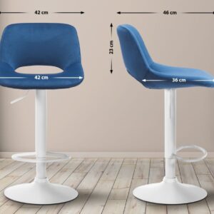 Barhocker Camden Samt-Bezug Der Barhocker Camden ist eine bequeme und gleichzeitig besonders stilvolle und moderne Sitzgelegenheit für die Hausbar, die Küche und mehr. Der Barstuhl verfügt über eine bequeme Polsterung über Sitzfläche und Rückenlehne, wodurch ein komfortables Sitzen auch über einen längeren Zeitraum hinaus ermöglicht wird. Das Polster ist mit einem hochwertigen Samt-Bezug versehen. Die Höhenverstellbarkeit des Metallgestells ermöglicht es Ihnen, die perfekte Sitzhöhe zu finden, und die 360-Grad-Drehfunktion sorgt für viel Bewegungsfreiheit. Die integrierte Fußstütze bietet zusätzlichen Sitzkomfort. Schließlich ist der Barstuhl mit Bodenschonern ausgestattet, sodass auch empfindliche Untergründe geschont werden. Details: Gesamthöhe: 86 – 107 cm Gesamtbreite: 42 cm Gesamttiefe: 46 cm Sitzhöhe: 60 – 81 cm Sitzfläche (B x T): 42 x 36 cm Höhe der Rückenlehne: 23 cm Max. Bel…