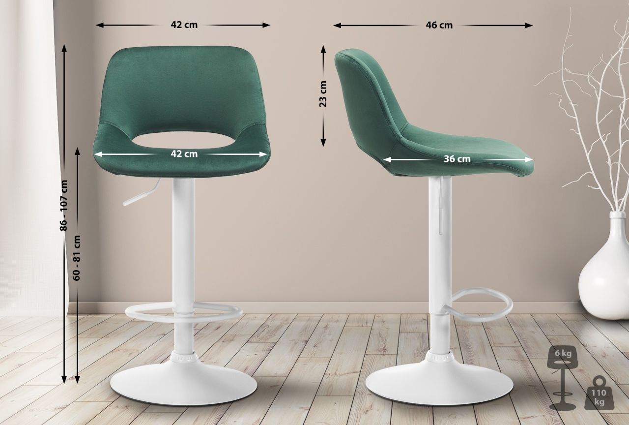 Barhocker Camden Samt-Bezug Der Barhocker Camden ist eine bequeme und gleichzeitig besonders stilvolle und moderne Sitzgelegenheit für die Hausbar, die Küche und mehr. Der Barstuhl verfügt über eine bequeme Polsterung über Sitzfläche und Rückenlehne, wodurch ein komfortables Sitzen auch über einen längeren Zeitraum hinaus ermöglicht wird. Das Polster ist mit einem hochwertigen Samt-Bezug versehen. Die Höhenverstellbarkeit des Metallgestells ermöglicht es Ihnen, die perfekte Sitzhöhe zu finden, und die 360-Grad-Drehfunktion sorgt für viel Bewegungsfreiheit. Die integrierte Fußstütze bietet zusätzlichen Sitzkomfort. Schließlich ist der Barstuhl mit Bodenschonern ausgestattet, sodass auch empfindliche Untergründe geschont werden. Details: Gesamthöhe: 86 – 107 cm Gesamtbreite: 42 cm Gesamttiefe: 46 cm Sitzhöhe: 60 – 81 cm Sitzfläche (B x T): 42 x 36 cm Höhe der Rückenlehne: 23 cm Max. Bel…