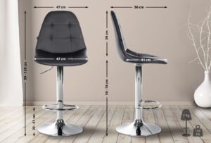 Barhocker Elmore Kunstleder-Bezug Moderne Optik und eine hochwertige Qualität verbindet der Barhocker Elmore. Der angenehm gepolsterte Hockersitz ist mit einem modernen und pflegeleichten Kunstleder-Bezug versehen und die Rückenlehne sorgt für hohen Sitzkomfort. Die Höhenverstellbarkeit des Metallgestells ermöglicht es, die perfekte Sitzhöhe zu finden, und die 360-Grad-Drehfunktion sorgt für viel Bewegungsfreiheit. Die integrierte Fußstütze bietet zusätzlichen Sitzkomfort. Schließlich ist der Barstuhl mit Bodenschonern ausgestattet, sodass auch empfindliche Untergründe geschont werden. Materialzusammensetzung: 100 % Polyurethan Details: Gesamthöhe: 99 – 120 cm Gesamtbreite: 47 cm Gesamttiefe: 56 cm Sitzhöhe: 58 – 78 cm Sitzfläche (B x T): 47 x 41 cm Höhe Rückenlehne: 39 cm Höhe Fußablage: 20 – 41 Max. Belastbarkeit: 120 kg Gewicht: 7 kg