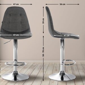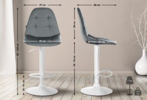 Barhocker Elmore Kunstleder-Bezug Moderne Optik und eine hochwertige Qualität verbindet der Barhocker Elmore. Der angenehm gepolsterte Hockersitz ist mit einem modernen und pflegeleichten Kunstleder-Bezug versehen und die Rückenlehne sorgt für hohen Sitzkomfort. Die Höhenverstellbarkeit des Metallgestells ermöglicht es, die perfekte Sitzhöhe zu finden, und die 360-Grad-Drehfunktion sorgt für viel Bewegungsfreiheit. Die integrierte Fußstütze bietet zusätzlichen Sitzkomfort. Schließlich ist der Barstuhl mit Bodenschonern ausgestattet, sodass auch empfindliche Untergründe geschont werden. Materialzusammensetzung: 100 % Polyurethan Details: Gesamthöhe: 99 – 120 cm Gesamtbreite: 47 cm Gesamttiefe: 56 cm Sitzhöhe: 58 – 78 cm Sitzfläche (B x T): 47 x 41 cm Höhe Rückenlehne: 39 cm Höhe Fußablage: 20 – 41 Max. Belastbarkeit: 120 kg Gewicht: 7 kg