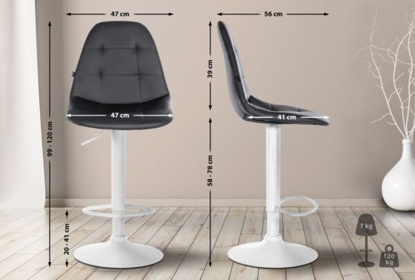 Barhocker Elmore Kunstleder-Bezug Moderne Optik und eine hochwertige Qualität verbindet der Barhocker Elmore. Der angenehm gepolsterte Hockersitz ist mit einem modernen und pflegeleichten Kunstleder-Bezug versehen und die Rückenlehne sorgt für hohen Sitzkomfort. Die Höhenverstellbarkeit des Metallgestells ermöglicht es, die perfekte Sitzhöhe zu finden, und die 360-Grad-Drehfunktion sorgt für viel Bewegungsfreiheit. Die integrierte Fußstütze bietet zusätzlichen Sitzkomfort. Schließlich ist der Barstuhl mit Bodenschonern ausgestattet, sodass auch empfindliche Untergründe geschont werden. Materialzusammensetzung: 100 % Polyurethan Details: Gesamthöhe: 99 – 120 cm Gesamtbreite: 47 cm Gesamttiefe: 56 cm Sitzhöhe: 58 – 78 cm Sitzfläche (B x T): 47 x 41 cm Höhe Rückenlehne: 39 cm Höhe Fußablage: 20 – 41 Max. Belastbarkeit: 120 kg Gewicht: 7 kg