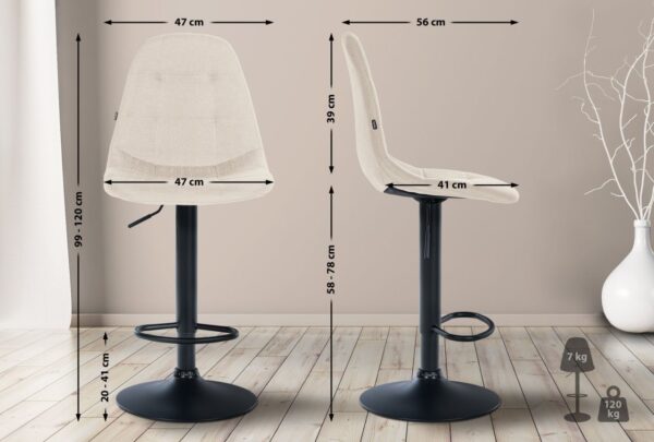 Barhocker Elmore Stoff-Bezug Moderne Optik und eine hochwertige Qualität verbindet der Barhocker Elmore. Der angenehm gepolsterte Hockersitz ist mit einem strapazierfähigem und pflegeleichten Stoff-Bezug versehen und die Rückenlehne sorgt für hohen Sitzkomfort. Die Höhenverstellbarkeit des Metallgestells ermöglicht es, die perfekte Sitzhöhe zu finden, und die 360-Grad-Drehfunktion sorgt für viel Bewegungsfreiheit. Die integrierte Fußstütze bietet zusätzlichen Sitzkomfort. Schließlich ist der Barstuhl mit Bodenschonern ausgestattet, sodass auch empfindliche Untergründe geschont werden. Materialzusammensetzung: 100 % Polyester Details: Gesamthöhe: 99 – 120 cm Gesamtbreite: 47 cm Gesamttiefe: 56 cm Sitzhöhe: 58 – 78 cm Sitzfläche (B x T): 47 x 41 cm Höhe Rückenlehne: 39 cm Höhe Fußablage: 20 – 41 Max. Belastbarkeit: 120 kg Gewicht: 7 kg