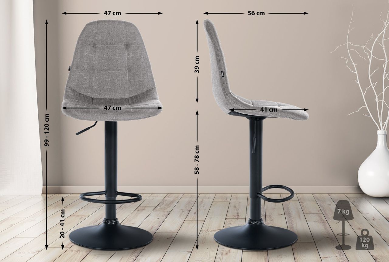 Barhocker Elmore Stoff-Bezug Moderne Optik und eine hochwertige Qualität verbindet der Barhocker Elmore. Der angenehm gepolsterte Hockersitz ist mit einem strapazierfähigem und pflegeleichten Stoff-Bezug versehen und die Rückenlehne sorgt für hohen Sitzkomfort. Die Höhenverstellbarkeit des Metallgestells ermöglicht es, die perfekte Sitzhöhe zu finden, und die 360-Grad-Drehfunktion sorgt für viel Bewegungsfreiheit. Die integrierte Fußstütze bietet zusätzlichen Sitzkomfort. Schließlich ist der Barstuhl mit Bodenschonern ausgestattet, sodass auch empfindliche Untergründe geschont werden. Materialzusammensetzung: 100 % Polyester Details: Gesamthöhe: 99 – 120 cm Gesamtbreite: 47 cm Gesamttiefe: 56 cm Sitzhöhe: 58 – 78 cm Sitzfläche (B x T): 47 x 41 cm Höhe Rückenlehne: 39 cm Höhe Fußablage: 20 – 41 Max. Belastbarkeit: 120 kg Gewicht: 7 kg
