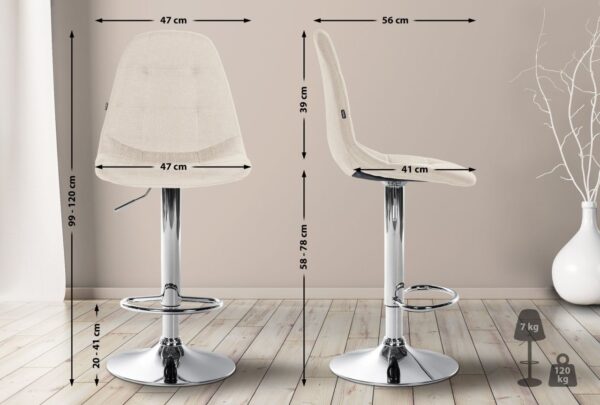 Barhocker Elmore Stoff-Bezug Moderne Optik und eine hochwertige Qualität verbindet der Barhocker Elmore. Der angenehm gepolsterte Hockersitz ist mit einem strapazierfähigem und pflegeleichten Stoff-Bezug versehen und die Rückenlehne sorgt für hohen Sitzkomfort. Die Höhenverstellbarkeit des Metallgestells ermöglicht es, die perfekte Sitzhöhe zu finden, und die 360-Grad-Drehfunktion sorgt für viel Bewegungsfreiheit. Die integrierte Fußstütze bietet zusätzlichen Sitzkomfort. Schließlich ist der Barstuhl mit Bodenschonern ausgestattet, sodass auch empfindliche Untergründe geschont werden. Materialzusammensetzung: 100 % Polyester Details: Gesamthöhe: 99 – 120 cm Gesamtbreite: 47 cm Gesamttiefe: 56 cm Sitzhöhe: 58 – 78 cm Sitzfläche (B x T): 47 x 41 cm Höhe Rückenlehne: 39 cm Höhe Fußablage: 20 – 41 Max. Belastbarkeit: 120 kg Gewicht: 7 kg
