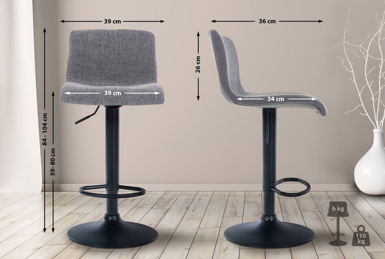 Barhocker Hover Stoff Der Barhocker Hover überzeugt durch sein modernes Design. Er passt zu nahezu jedem Stil und verleiht jeder Bar ein mondänes Wohngefühl. Durch die stufenlose Höhenverstellbarkeit ist der Barhocker universell einsetzbar und für alle Thekenhöhen geeignet. Die ergonomisch geformte Sitzfläche passt sich dem Körper an. Die Rückenlehne, die drehbare Sitzfläche und die Fußstütze ermöglichen ein bequemes Sitzen auch über Stunden hinweg. Der Sitz mit Stoffbezug (Polyester) und das Metall-Gestell sind sehr leicht zu reinigen. Materialzusammensetzung: 100% Polyester Ca. Maße: Gesamthöhe: 84 – 104 cm Gesamtbreite: 39 cm Gesamttiefe: 36 cm Sitzhöhe: 59 – 80 cm Sitzfläche (BxT): 39 x 34 cm Höhe Rückenlehne: 26 cm Gewicht: 6 kg Max. Belastbarkeit: 110 kg Sitz: Material: Stoff Angenehme Sitzposition durch Rückenlehne Gestell: Material: Metall Trompetenfuß inkl. Bodenschoner Komfo…