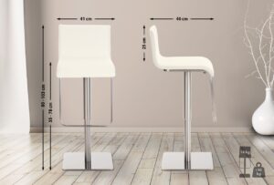 Barhocker Limon Kunstleder-Bezug Der Barhocker Limon ist eine besonders modern anmutende Wahl für Ihre Hausbar, die Küche oder den Wohnbereich. Für einen Barhocker essenziell ist die stufenlose Höhenverstellbarkeit. Außerdem lässt sich der Barstuhl um 360 Grad um die eigene Achse drehen. Für zusätzlichen Sitzkomfort sorgen sowohl die Rückenlehne als auch die Fußablage. Das standsichere Gestell besteht aus Metall, während die gepolsterte Sitzfläche mit pflegeleichtem und langlebigem Kunstleder bezogen ist. Materialzusammensetzung: 100% Polyurethan Details: Gesamtbreite: 41 cm Gesamthöhe: 80 – 103 Gesamttiefe: 46 cm Sitzhöhe: 55 – 78 cm Höhe Rückenlehne: 25 cm Gewicht: 14 kg Sitz Sitz und Rückenlehne bequem gepolstert Angenehme Sitzposition durch Rückenlehne Gestell Stilvolle Fußstütze Barhocker mit eckiger Bodenplatte Besonderheiten Sitz um 360° drehbar Stufenlos höhenverstellbar Stabi…