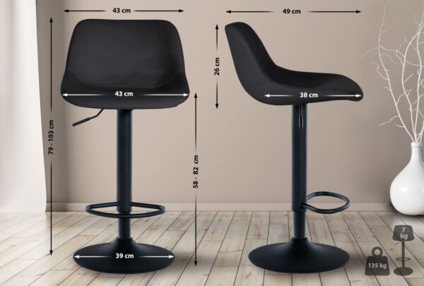 Barhocker Loft Der Barhocker Loft verleiht jedem Raum eine exklusive Note und überzeugt nicht nur durch seine hervorragenden Sitzeigenschaften, sondern auch durch sein modernes Design. Eine bequeme Rückenlehne und die angenehme Polsterung des Sitzes bieten einen hohen Komfort. Die Sitzfläche ist wahlweise in Stoff, Samt oder Kunstleder erhältlich. Der Trompetenfuß des Tresenstuhls ist um 360° drehbar und besitzt eine Fußstütze, wodurch ein angenehmes Sitzen über eine längere Zeit gewährleistet ist. Das Metall-Gestell in Schwarz ist höhenverstellbar und bietet einen sicheren Stand. Außerdem ist das Gestell mit Bodenschonern ausgestattet, um ein Zerkratzen des Bodens zu vermeiden. Durch seine unterschiedlichen Farb- und Materialkombinationen ist dieser Thekenstuhl immer eine ausgezeichnete Wahl, ob für die Küche, Wohnzimmer, Lobby oder Esszimmer. Materialzusammensetzung: 100% Polyester …