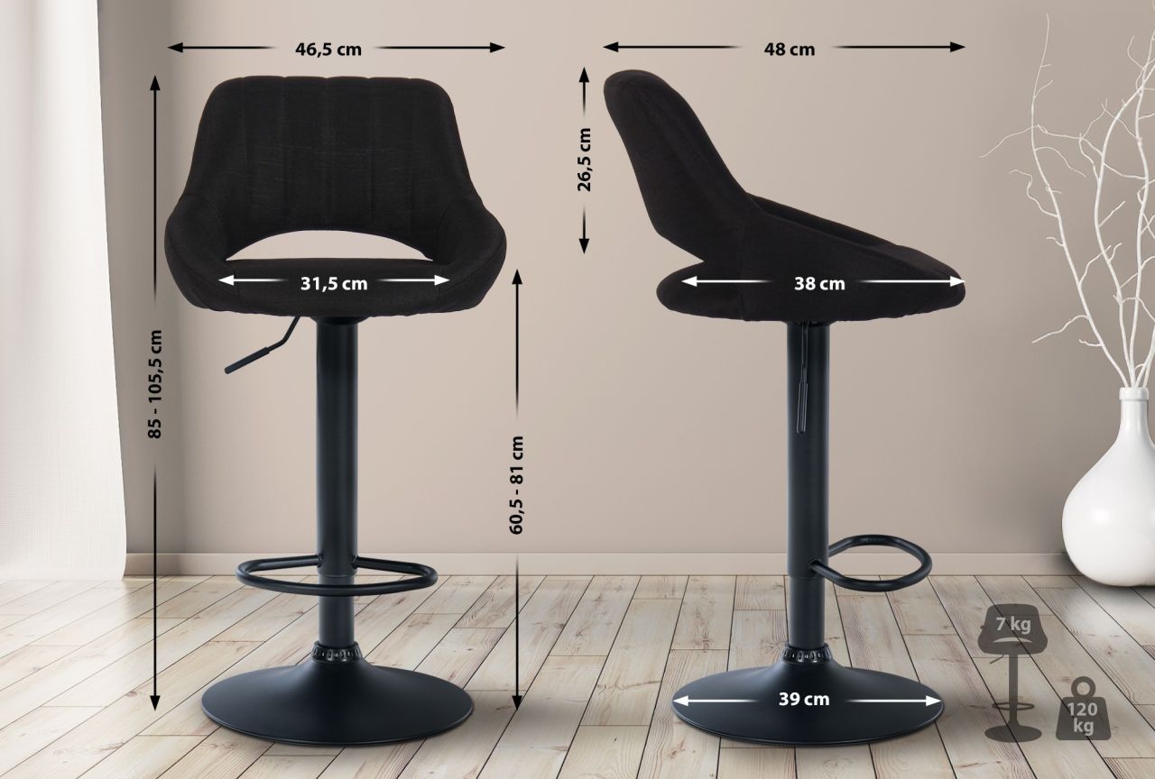 Barhocker Milet Stoff-Bezug Moderne Optik und eine hochwertige Qualität finden sich im Barhocker Milet. Der angenehm gepolsterte Hockersitz ist mit einem strapazierfähigem und pflegeleichten Stoff-Bezug versehen und die niedrige Rückenlehne bietet Unterstützung im Lendenwirbelbereich. Die Höhenverstellbarkeit des Metallgestells ermöglicht es Ihnen, die perfekte Sitzhöhe zu finden, und die 360-Grad-Drehfunktion sorgt für viel Bewegungsfreiheit. Die integrierte Fußstütze bietet zusätzlichen Sitzkomfort. Schließlich ist der Barstuhl mit Bodenschonern ausgestattet, sodass auch empfindliche Untergründe geschont werden. Materialzusammensetzung: 100% Polyester Details: Gesamthöhe: 85 – 106 cm Gesamtbreite: 47 cm Gesamttiefe: 48 cm Sitzhöhe: 60 – 81 cm Sitzfläche (B x T): 32 x 38 cm Höhe Rückenlehne: 27 cm Max. Belastbarkeit: 150 kg Gewicht: 7 kg
