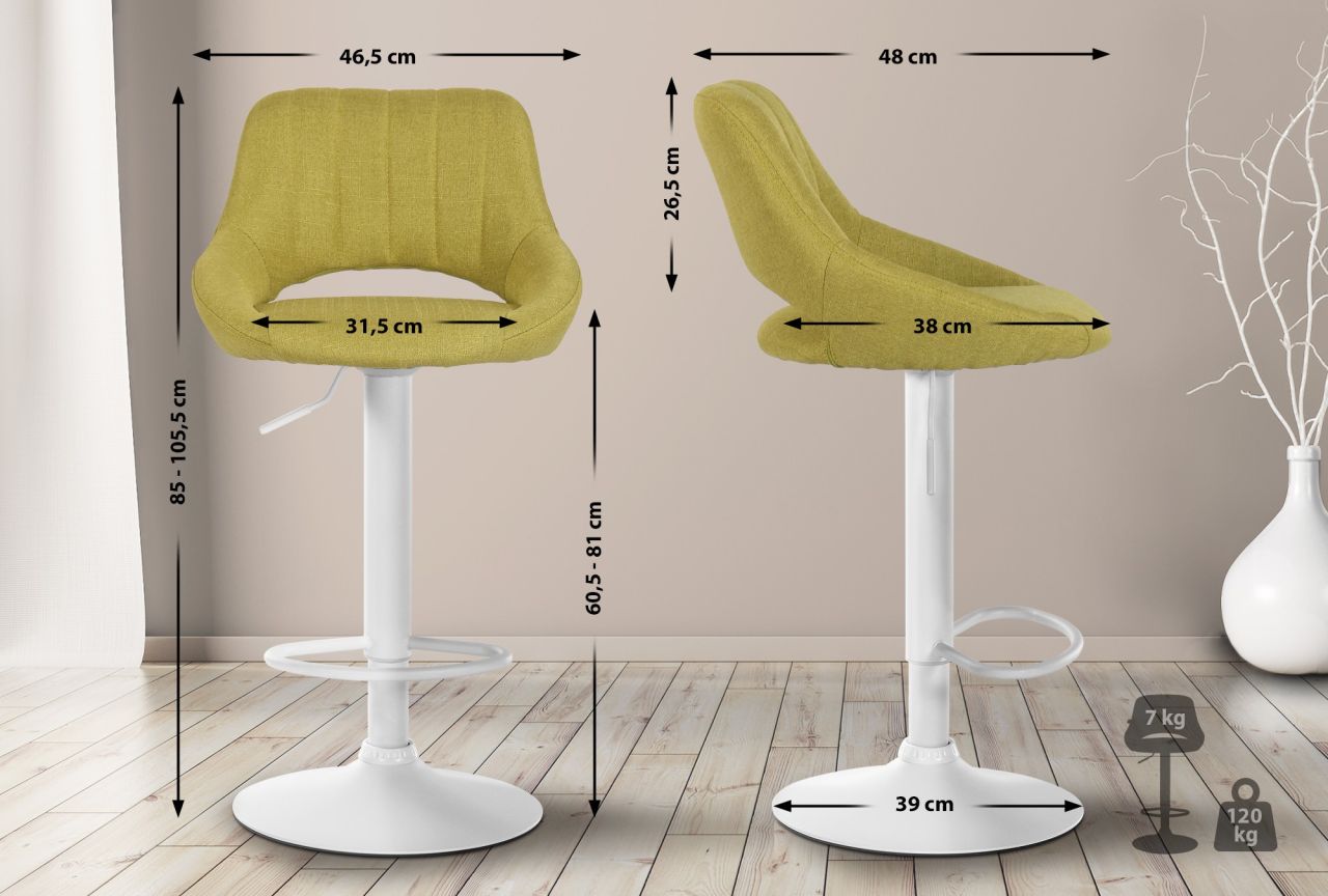 Barhocker Milet Stoff-Bezug Moderne Optik und eine hochwertige Qualität finden sich im Barhocker Milet. Der angenehm gepolsterte Hockersitz ist mit einem strapazierfähigem und pflegeleichten Stoff-Bezug versehen und die niedrige Rückenlehne bietet Unterstützung im Lendenwirbelbereich. Die Höhenverstellbarkeit des Metallgestells ermöglicht es Ihnen, die perfekte Sitzhöhe zu finden, und die 360-Grad-Drehfunktion sorgt für viel Bewegungsfreiheit. Die integrierte Fußstütze bietet zusätzlichen Sitzkomfort. Schließlich ist der Barstuhl mit Bodenschonern ausgestattet, sodass auch empfindliche Untergründe geschont werden. Materialzusammensetzung: 100% Polyester Details: Gesamthöhe: 85 – 106 cm Gesamtbreite: 47 cm Gesamttiefe: 48 cm Sitzhöhe: 60 – 81 cm Sitzfläche (B x T): 32 x 38 cm Höhe Rückenlehne: 27 cm Max. Belastbarkeit: 150 kg Gewicht: 7 kg
