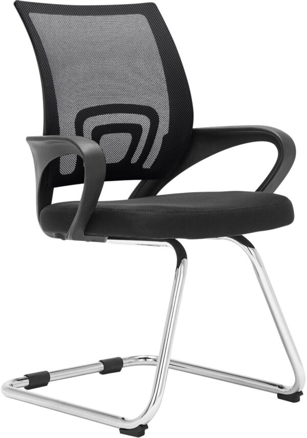 Besucherstuhl Eureka Der Freischwinger-Stuhl Eureka vereint Sitzkomfort mit zeitlosem Design. Sein klassisches und gleichzeitig modernes Freischwinger-Gestell aus robustem Metall überzeugt durch ein ansprechendes Sitzgefühl. Der gepolsterte Sitz und die ergonomisch gekrümmte Rückenlehne mit Netz-Bezug bieten ein hohes Maß an Bequemlichkeit. Dabei eignet sich der Stuhl sowohl für professionelle Settings, wie Veranstaltungen, Konferenzen, Wartezimmer, als auch für private Zwecke, wie Küche, Esszimmer, Wohnzimmer und mehr. Das hochwertige Stuhlpolster ist mit einem strapazierfähigem Stoff-Bezug versehen. Die sorgfältige Verarbeitung und die hochwertigen Materialien machen den Freischwinger Eureka zu einer tollen Wahl. Bodenschoner am Stuhlgestell schützen empfindliche Untergründe. Materialzusammensetzung: 100 % Polyester Details: Gesamthöhe: 89 cm Gesamtbreite: 58 cm Gesamttiefe: 61 cm S…