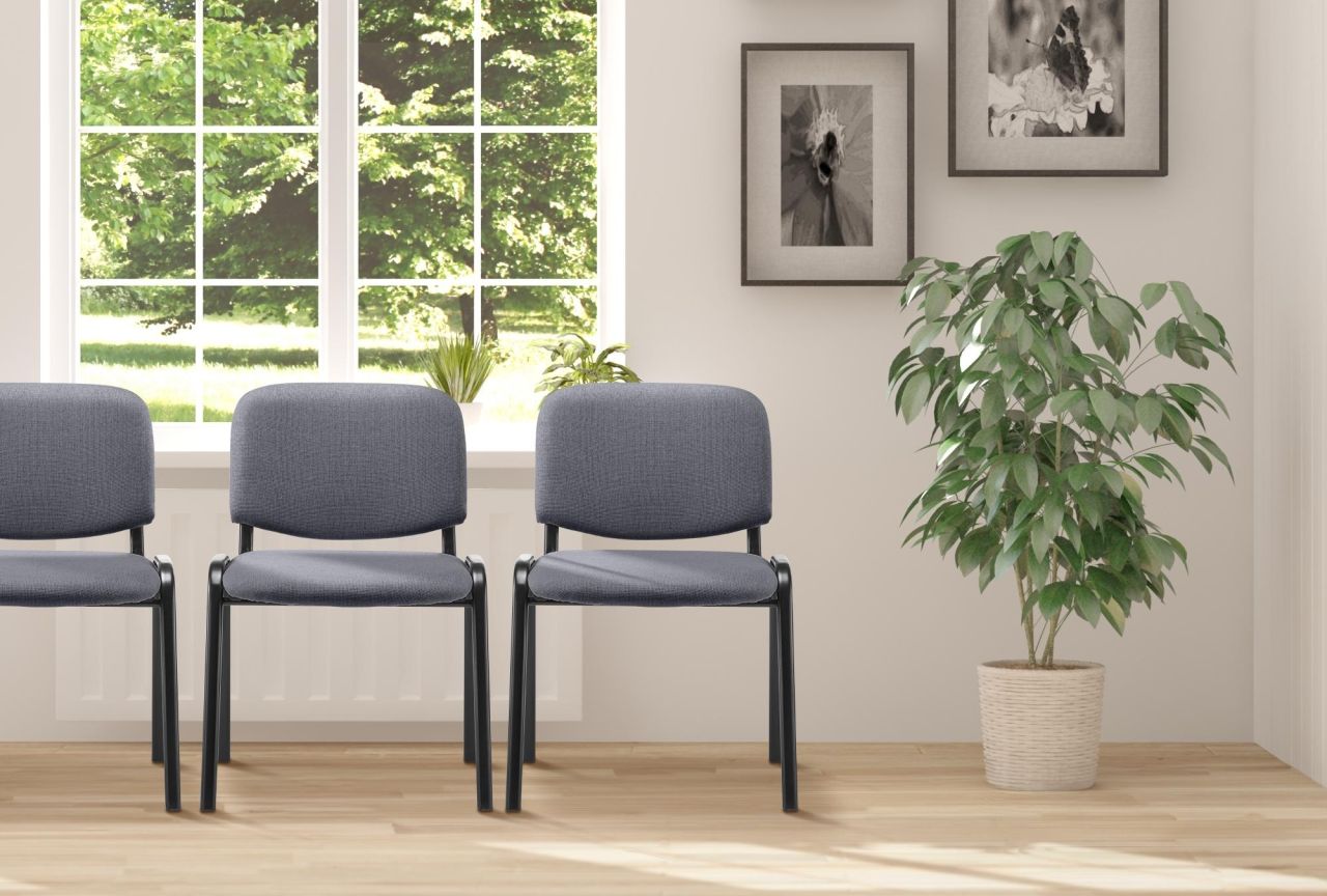 Stapelstuhl Ken mit Stoff-Bezug Der Stapelstuhl Ken vereint Sitzkomfort mit einfachem und modernem Design. Damit ist der Stuhl für professionelle Umfelder, wie Konferenzen, Messen, Schulungen, Veranstaltungen etc. ideal geeignet. Die gepolsterte Sitzfläche und Rückenlehne, bezogen mit strapazierfähigem Stoff, bieten ein langanhaltendend angenehmes Sitzgefühl. Dank des schwarzen Vierfußgestells aus Metall steht der Stuhl standsicher und stabil – bei einer maximalen Belastbarkeit von 120 kg. Bis zu vier Stühle können jeweils gestapelt werden, sodass diese platzsparend und flexibel gelagert und eingesetzt werden können. Bodenschoner aus Kunststoff verhindern, dass empfindliche Böden Schaden nehmen. Materialzusammensetzung: 100 % Polyester Maße: Gesamthöhe: 83 cm Gesamtbreite: 53 cm Gesamttiefe: 53 cm Sitzhöhe: 44 cm Sitzfläche (B x T): 48 x 40 cm Höhe Rückenlehne: 38 cm Max. Belastbarkei…