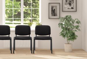 Stapelstuhl Ken mit Stoff-Bezug Der Stapelstuhl Ken vereint Sitzkomfort mit einfachem und modernem Design. Damit ist der Stuhl für professionelle Umfelder, wie Konferenzen, Messen, Schulungen, Veranstaltungen etc. ideal geeignet. Die gepolsterte Sitzfläche und Rückenlehne, bezogen mit strapazierfähigem Stoff, bieten ein langanhaltendend angenehmes Sitzgefühl. Dank des schwarzen Vierfußgestells aus Metall steht der Stuhl standsicher und stabil – bei einer maximalen Belastbarkeit von 120 kg. Bis zu vier Stühle können jeweils gestapelt werden, sodass diese platzsparend und flexibel gelagert und eingesetzt werden können. Bodenschoner aus Kunststoff verhindern, dass empfindliche Böden Schaden nehmen. Materialzusammensetzung: 100 % Polyester Maße: Gesamthöhe: 83 cm Gesamtbreite: 53 cm Gesamttiefe: 53 cm Sitzhöhe: 44 cm Sitzfläche (B x T): 48 x 40 cm Höhe Rückenlehne: 38 cm Max. Belastbarkei…