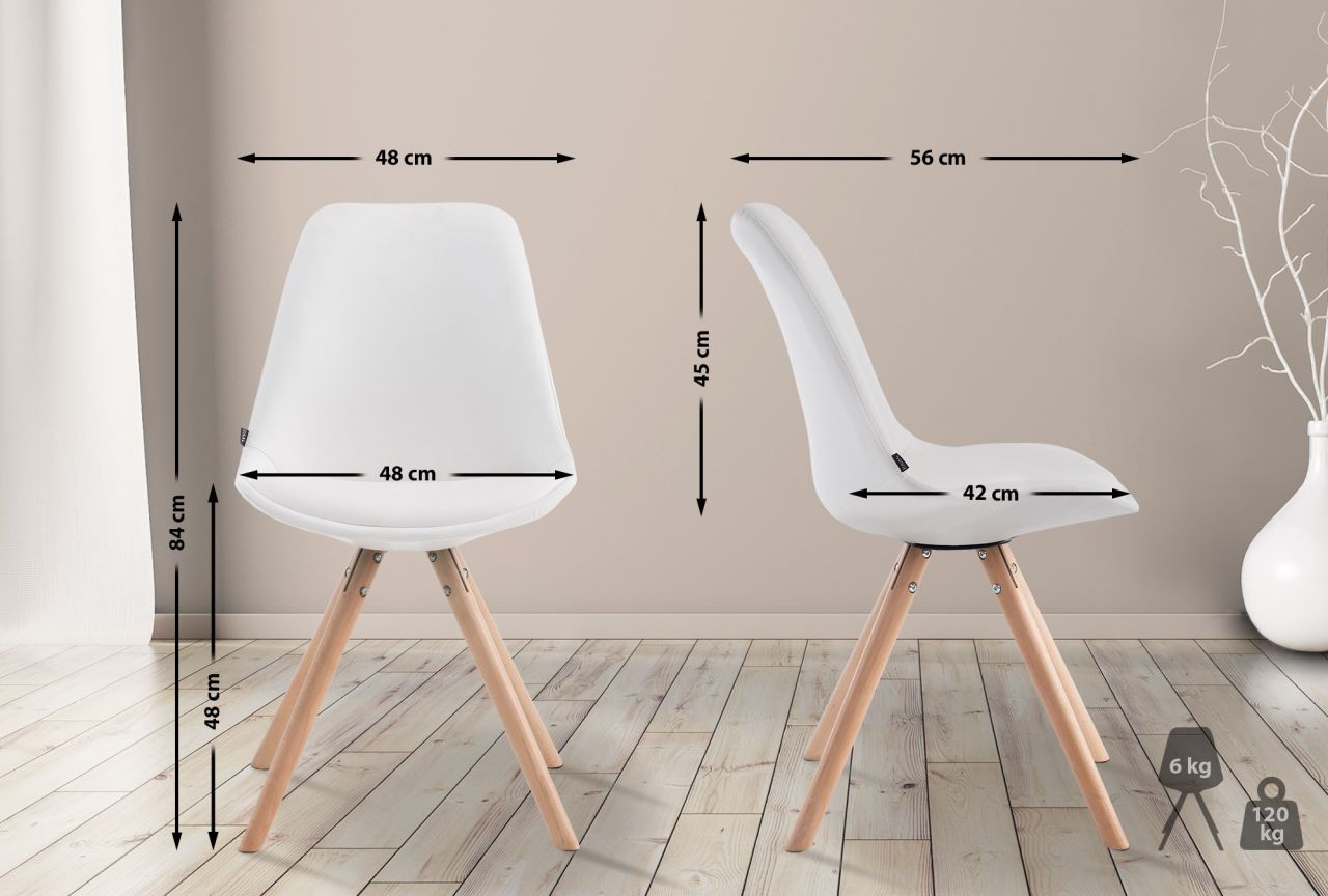 Esszimmerstuhl Laval Rund Kunstleder-Bezug Der Esszimmerstuhl Laval kombiniert hohen Sitzkomfort mit einer modernen zeitgemäßen Optik. Für Ihren Esszimmertisch, die Küche, das Wohnzimmer, aber auch für andere Zwecke ist dieser Polsterstuhl somit eine tolle Wahl. Entscheidend für einen bequemen Sitz ist die angenehme Polsterung über Sitz und Rückenlehne. Dabei sind sowohl Sitzschale als auch Rückenlehne durchgängig mit einem hochwertigen und pflegeleichten Kunstleder-Bezug versehen. Fundament für diesen Esszimmerstuhl ist das standsichere Vierfußgestell aus Buchenholz. So kann der Stuhl Laval bedenkenlos bis 120 Kilogramm belastet werden. Bodenschoner unter den runden Stuhlbeinen beugen dabei Beschädigungen empfindlicher Böden vor. Materialzusammensetzung: 100 % Polyurethan Details: Gesamthöhe: 84 cm Gesamtbreite: 48 cm Gesamttiefe: 56 cm Sitzhöhe: 48 cm Sitzfläche (B x T): 48 x 42 cm …