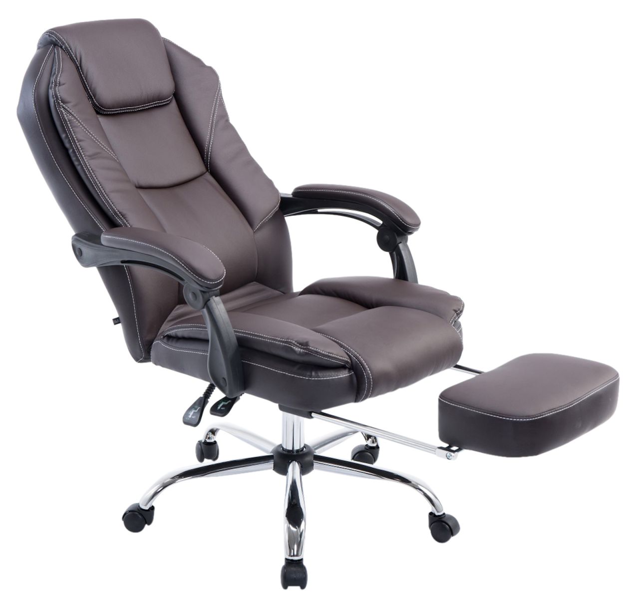 Bürostuhl Castle Mit dem Bürostuhl Castle ist Gemütlichkeit im klassischen Look angesagt. Eine hochwertige Polsterung und ein pflegeleichter Kunstlederbezug sorgen für ein komfortables Sitzgefühl, welches auch bei längerem Verweilen bestehen bleibt. Die leicht verstellbare Fußstütze und Rückenlehne sorgen zusätzlich für eine angenehme Pause zwischendurch, bei der sich entspannt zurückgelehnt werden darf und die Beine hochgelegt werden können. Dank der stufenlos verstellbaren Sitzhöhe garantiert der Bürostuhl Castle zudem jederzeit ein ergonomisches Sitzen. Dabei steht er standsicher auf fünf Leichtlaufrollen und einem Gestell aus Metall in Chromoptik. Materialzusammensetzung: 100% Polyurethan Ca. Maße: Gesamtbreite: 67 cm Gesamttiefe: 64 cm Gesamthöhe: 114 – 124 cm Sitzhöhe: 47 – 57 cm Sitzfläche (BxT): 52,5 x 52 cm Armlehnenhöhe: 67 – 77 cm Rückenlehne (BxH): 54 x 77 cm Max. Belastba…