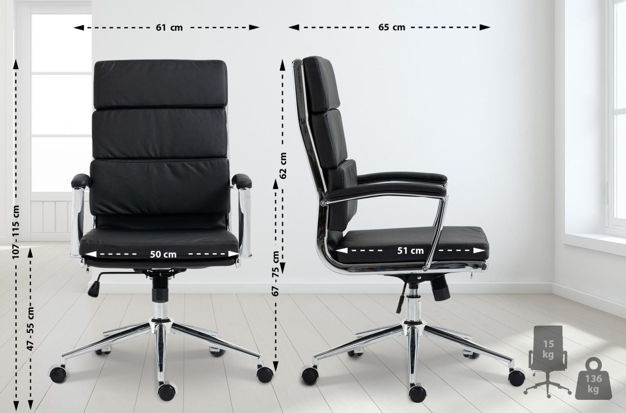 Bürostuhl Cleveland Der Bürostuhl Cleveland vereint ergonomisches Design mit individuellem Komfort und stilvoller Optik. Er ist die perfekte Ergänzung für jedes Büro, in dem Gesundheit und Wohlbefinden am Arbeitsplatz großgeschrieben werden. Die dreifach gepolsterte Rückenlehne und die ergonomische Form unterstützen Ihre natürliche Sitzhaltung. Mit der höhenverstellbaren Sitzfläche, der einstellbaren Wippfunktion und den 360° drehbaren Leichtlaufrollen passt sich der Stuhl flexibel Ihren Bedürfnissen an. Die Auswahl zwischen Echtleder, Kunstleder oder Stoffbezug ermöglicht eine individuelle Gestaltung nach Ihrem persönlichen Geschmack. Das Chromgestell bietet Stabilität und eine lange Lebensdauer. Mit seiner breiten Sitzfläche bietet der Cleveland auch an langen Arbeitstagen optimalen Sitzkomfort. Ca. Maße: Gesamthöhe: 107 – 115 cm Gesamtbreite: 61 cm Gesamttiefe: 65 cm Sitzhöhe: 47 -…