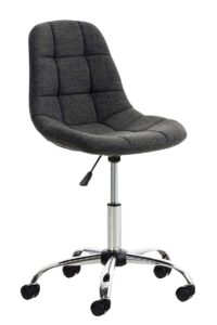 Bürostuhl Emil Der Bürostuhl Emil besticht durch seine komfortable Polsterung und einen schlanken, rundlichen Look. Rechteckige Ziernähte und klare Farbvarianten machen den Bürostuhl zum optischen Highlight an jedem Arbeitsplatz. Der filigrane Sitz ist mit einem Stoffbezug überzogen und dank einer stufenlos verstellbaren Sitzhöhe ist das ergonomische Sitzen garantiert. Dabei steht er standsicher auf fünf Leichtlaufrollen und einem Gestell aus Metall in Chromoptik. Egal ob Hart- oder Teppichböden man kann immer leicht und locker über den Boden rollen. Materialzusammensetzung: 100% Polyester Sitz: Bezug: Stoff Sitz und Rückenlehne bequem gepolstert Angenehme Sitzposition durch Rückenlehne Gestell: Material: Metall in Chromoptik Inklusive 5 Leichtlaufrollen Mit stabilem Metall Drehkreuz Besonderheiten: Moderner Look trifft auf optimalen Komfort Höhenverstellbar und drehbar Stabile Kons…