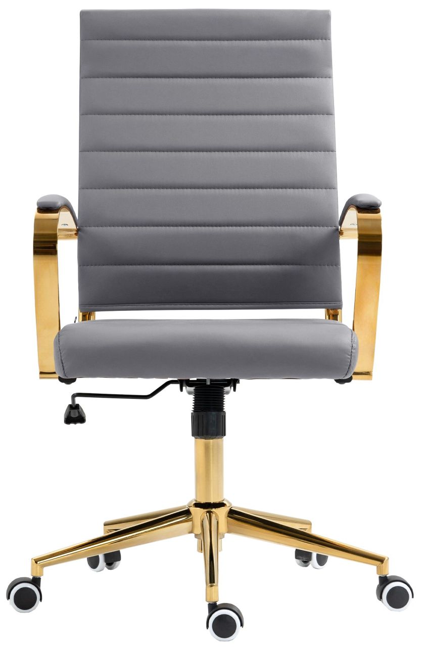 Bürostuhl Havanna Kunstleder Dieser Bürostuhl aus Kunstleder kombiniert elegantes Design mit hoher Funktionalität und Komfort. Die ergonomische Rückenlehne und die gepolsterten Armlehnen bieten optimale Unterstützung und Sitzkomfort. Der Stuhl ist höhenverstellbar und um 360° drehbar, was maximale Flexibilität und Bewegungsfreiheit ermöglicht. Mit der praktischen Wippfunktion können Sie sich entspannt zurücklehnen und kurzzeitig entspannen. Die robuste Konstruktion gewährleistet eine hohe Stabilität und eine maximale Belastbarkeit von 136 kg. Die stilvolle Gold-Optik und die gummierten Leichtlaufrollen schützen Ihren Boden und verleihen Ihrem Büro einen Hauch von Eleganz. Materialzusammensetzung: 100% Polyurethan Ca. Maße: Gesamthöhe: 99 – 109 cm Gesamtbreite: 57 cm Gesamttiefe: 59 cm Sitzhöhe: 46 – 55 cm Sitzfläche (BxT): 49 x 49 cm Höhe Rückenlehne (vom Sitz): 53 cm Höhe Armlehne (v…