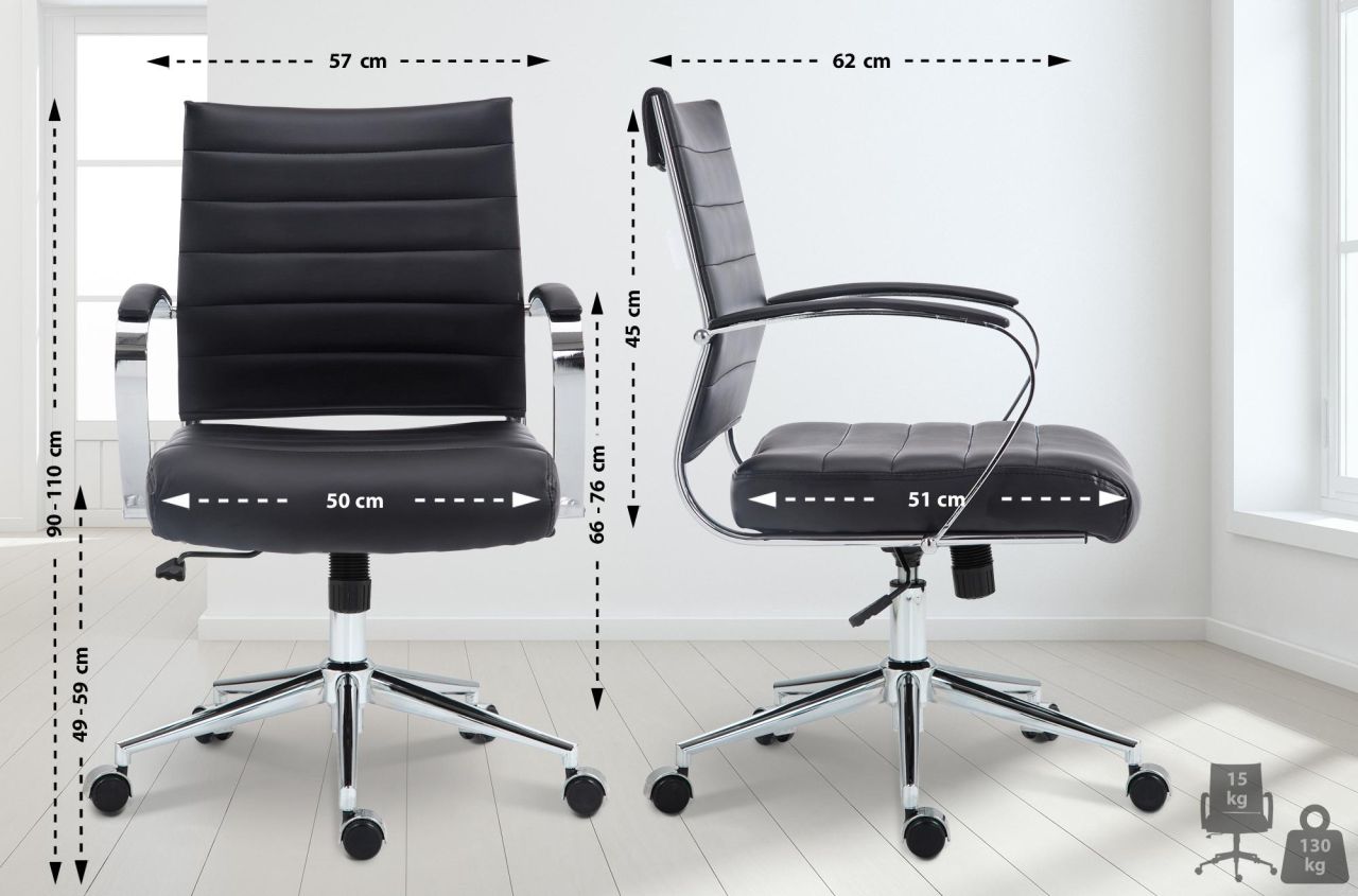 Bürostuhl Oakland Der Bürostuhl Oakland vereint ergonomisches Design mit individuellem Komfort und stilvoller Optik. Er ist die perfekte Ergänzung für jedes Büro, in dem Gesundheit und Wohlbefinden am Arbeitsplatz großgeschrieben werden. Die gepolsterte Rückenlehne und die ergonomische Form unterstützen Ihre natürliche Sitzhaltung. Mit der höhenverstellbaren Sitzfläche, der einstellbaren Wippfunktion und den 360° drehbaren Leichtlaufrollen passt sich der Stuhl flexibel Ihren Bedürfnissen an. Das Chromgestell bietet Stabilität und eine lange Lebensdauer. Mit seiner breiten Sitzfläche bietet der Oakland auch an langen Arbeitstagen optimalen Sitzkomfort. Details: Gesamthöhe: 90 – 100 cm Gesamtbreite: 57 cm Gesamttiefe: 62 cm Sitzhöhe: 49 – 59 cm Sitzfläche (B x T): 50 x 51 cm Dicke Sitzkissen: 8 cm Höhe Rückenlehne: 45 cm Breite Rückenlehne: 44 cm Höhe Armlehne (ab Boden): 66 – 76 cm Max…