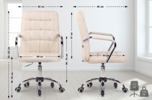 Bürostuhl Terni Der Bürostuhl Terni überzeugt mit modernes Design und bietet angenehmen Sitzkomfort für Arbeitszimmer, Büro und Co. Der Schreibtischstuhl ist mit einer hochwertigen Polsterung über Sitzfläche und Rückenlehne versehen – wahlweise aus Kunstleder oder Stoff. Dabei ziert das schöne Steppmuster den Polsterbezug. Für bequemes Sitzen sorgen neben der Rückenlehne die Armlehnen. Darüber hinaus ist der Arbeitsstuhl stufenlos höhenverstellbar und um 360 Grad drehbar. Der Drehstuhl steht standsicher auf einem Gestell aus in Chrom-Optik gehaltenem Metall. Die fünf Leichtlaufrollen ermöglichen einfaches Bewegen und der Schreibtischstuhl ist bedenkenlos mit bis zu 120 Kilogramm belastbar. Materialzusammensetzung: 100 % Polyurethan (Kunstleder) / 100 % Polyester (Stoff) Details: Gesamthöhe: 93 – 103 cm Gesamtbreite: 56 cm Gesamttiefe: 60 cm Sitzhöhe: 46 – 56 cm Sitzfläche (B x T): 49 …